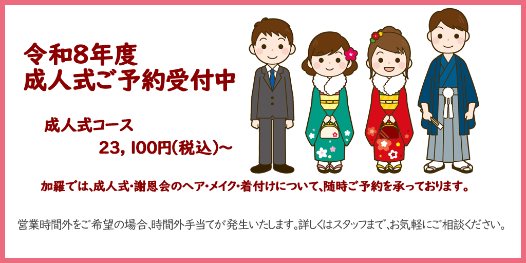 ※お休み中は電話予約は受け付けておりませんが、WEB予約は可能です。 ご迷惑をおかけしますが、よろしくお願いいたします。成人式 着付け・ヘアセット随時受付中