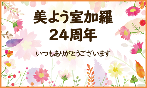 美よう室加羅は25年目になり、地域一番お客様に愛される店を目指し、社員一同お客様の悩みを解決できるよう日々精進し、技術・知識・接客の向上を目指していきたいと思いますので、これからもよろしくお願い致します。